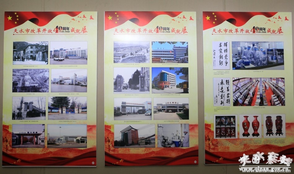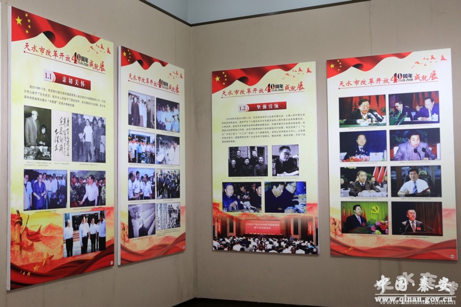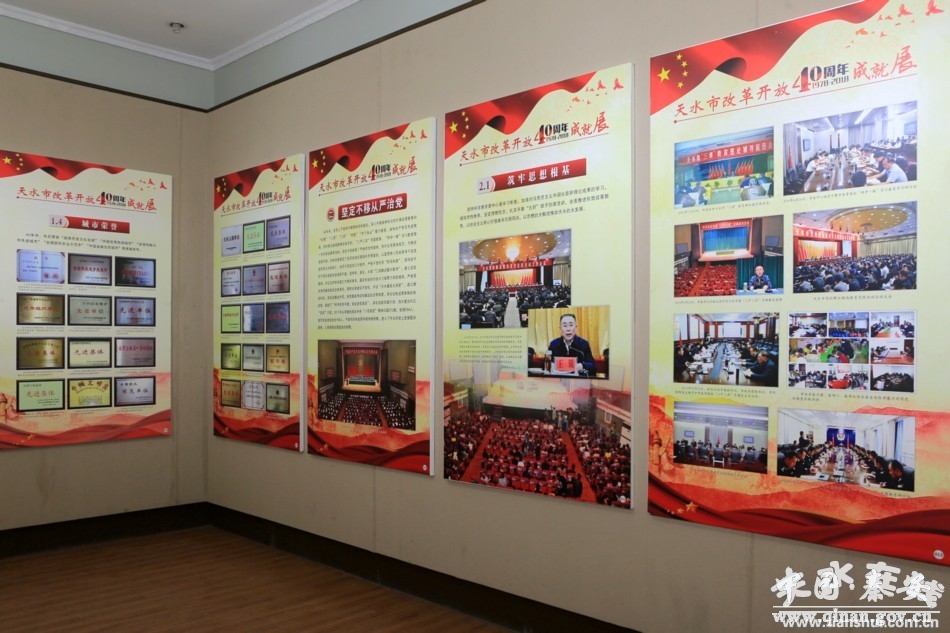 据了解,为展示天水人民40年来的奋斗历程和辉煌成就,本次展览以习近平总书记视察甘肃时提出的“八个着力”为指导思想,分“亲临指导”“坚定不移全面从严治党”“转变发展方式提高综合实力”“发展现代农业增强供给能力”“全力推进扶贫开发”“文化旅游融合发展”“着力提升城市综合实力”“加强生态环境保护”“保障和改善民生”“平安建设深入推进”等十个板块,共150个版面1300余张图片。用文字和图片相结合,以图片为主的形式,对天水市40年来所走过不平凡的历程,特别是党的十八大以来在改革开放中敢于拼搏、奋发有为的良好精神面貌,激励全市上下不忘初心、牢记使命,开拓进取、扎实工作,为加快推进全面建成小康社会、建设幸福美好新天水所做出的成就进行全方位展示。