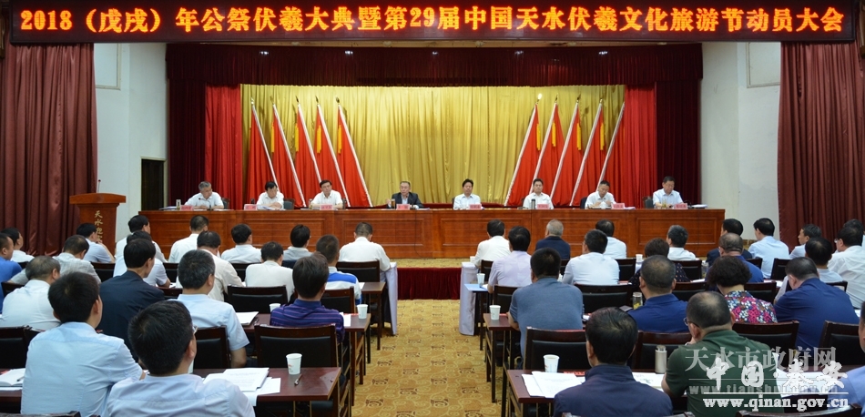 6月12日,天水市委、市政府召开2018(戊戌)年公祭中华人文始祖伏羲大典暨第29届中国天水伏羲文化旅游节动员大会。市委书记王锐强调,全市各级各部门要进一步统一思想、靠实责任,细化措施、抓好落实,以求真务实的工作态度和严谨细致的工作作风,做细做实各项筹备工作,齐心协力把本届节会办成一次独具特色的文化盛典。市委常委、常务副市长赵四辈主持会议,市委常委、宣传部部长张建杰通报节会筹备工作进展情况。市领导张明泰、赵卫东、王国先、雷鸣、王洪义出席会议。