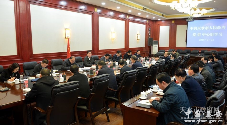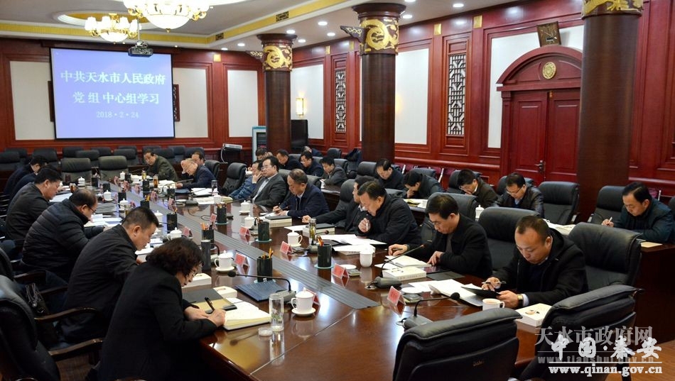 2月24日,天水市政府党组书记、市长王军主持市政府党组理论学习中心组学习,集中一天时间全文学习了习近平总书记在党的十九届二中全会上的重要讲话、在第十九届中央纪律检查委员会第二次全体会议上的重要讲话、在新进中央委员会的委员候补委员和省部级主要领导干部学习贯彻习近平新时代中国特色社会主义思想和党的十九大精神研讨班上的重要讲话,学习了《习近平谈治国理政》第二卷第一个专题和王沪宁、赵乐际同志有关讲话和报告精神。