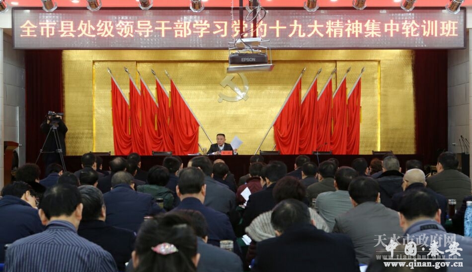 1月17日,市委书记王锐为全市县处级领导干部学习贯彻党的十九大精神第一期轮训班学员作专题辅导报告,他与全体学员交流了学习党的十九大精神的体会和认识,带领大家掌握党的十九大报告的精髓和实质,并要求全市上下用党的十九大精神统领全局,紧紧围绕决胜全面建成小康社会总目标,坚决打好防范化解重大风险、精准脱贫和污染防治攻坚战,为建设幸福美好新天水作出更大贡献。