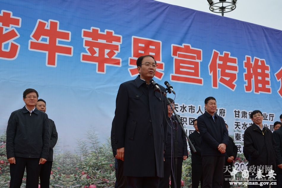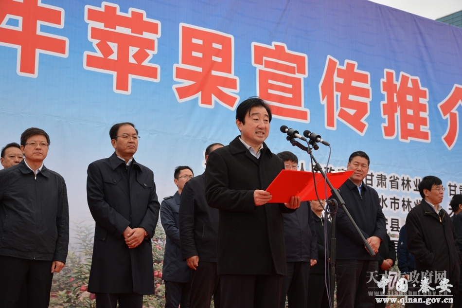 国家林业局造林绿化司巡视员刘树人,中国农产品市场协会执行会长、北京新发地农产品批发市场董事长张玉玺分别讲话。天水市政府副市长霍卫平宣读了《天水市人民政府关于命名苹果标准化示范基地和表彰十佳花牛苹果营销企业果品产业发展先进工作者花牛苹果种植能手及花牛苹果大奖赛获奖产品的决定》。