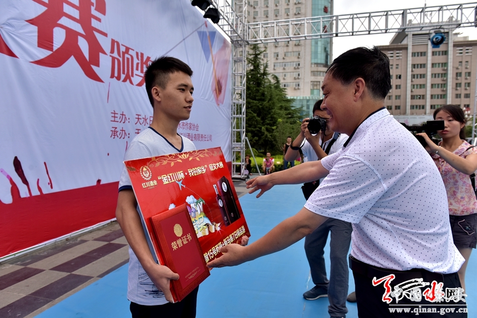 当日由由天水日报社、天水晚报、天水市作家协会,联合甘肃红川酒业有限责任公司举办的“金红川杯·我的家乡”2017应届高中毕业生作文大赛颁奖仪式在陇城广场举行,