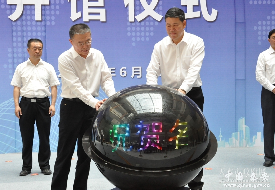 ▲天水市委书记王锐,市委副书记、代市长王军共同按下触摸器启动天水会展中心开馆及展销活动
