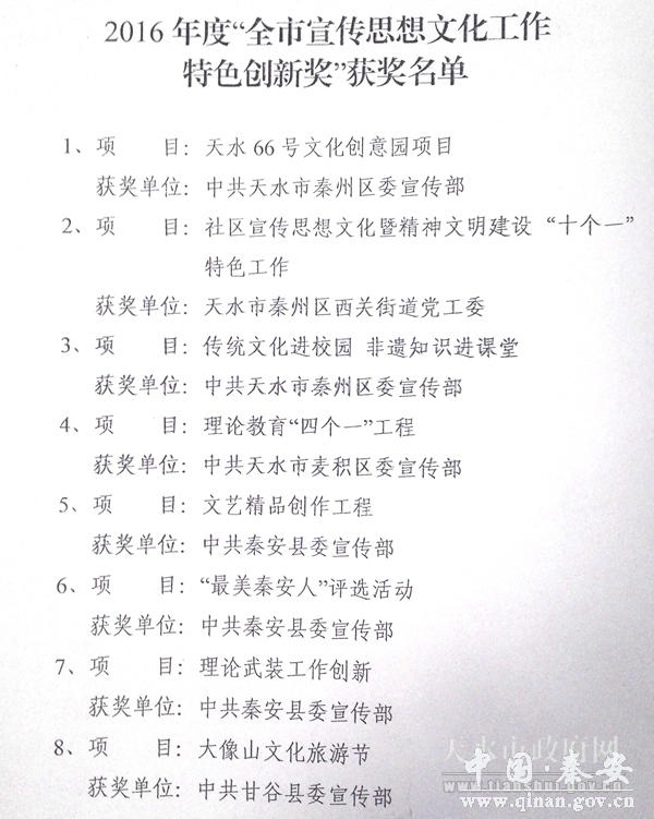 2月21日召开的全市宣传思想工作会议上,2016年度全市宣传思想工作先进县区及特色创新奖揭晓。秦州、清水和秦安三县区被评为2016年度宣传思想工作先进县区;天水66号文化创意园项目等36个项目获2016年度“全市宣传思想文化工作特色创新奖”,其中,天水日报社报送的“中国天水.李杜诗歌节”、天天天水网报送的“|微电影拍摄工程”榜上有名。