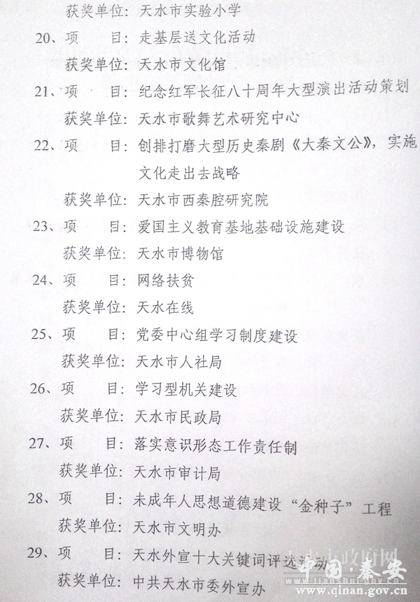 为表彰先进、树立典型,进一步激发全市宣传思想文化战线的创造活力,形成鼓励创新的良好氛围和激励机制,推动我市宣传思想文化工作出特色、出亮点、出经验,按照2016年度宣传思想文化工作目标责任考核结果,经市委宣传部研究,决定授予秦州区等三个县区“2016年度全市宣传思想工作先进县区”称号,授予“天水66号文化创意园项目”等36项工作为2016年度“全市宣传思想文化工作特色创新奖”。