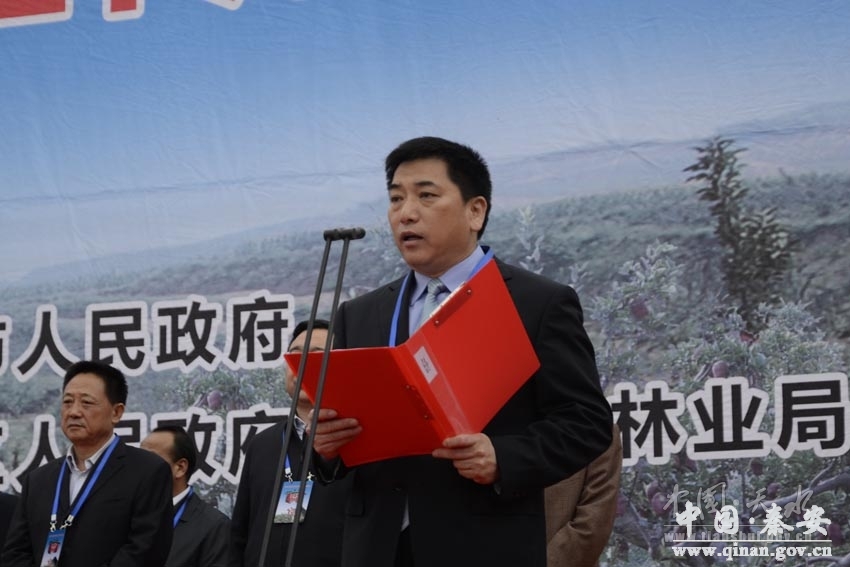 甘肃省工商局副局长、省非工企业工委书记万泽刚宣布花牛苹果被认定为中国驰名商标并讲话