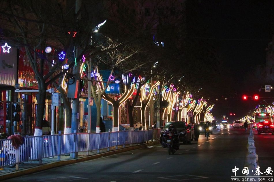 “接汉疑星落,依楼似月悬”。春节临近,秦安街区的灯笼流光溢彩,街道两旁的树木也都被五颜六色的彩灯缠绕出来,一盏盏路灯灿若星辰,一棵棵树穿上了五颜六色的“新衣”,形成一排排彩色梦幻的花灯海洋,如梦如幻,在光与影的跃动交汇中,亮化线条与建筑完美契合,映衬出龙年浓浓的年味,为这座小城的夜景注入了新的活力,也为市民的幸福生活涂上了靓丽的色彩。