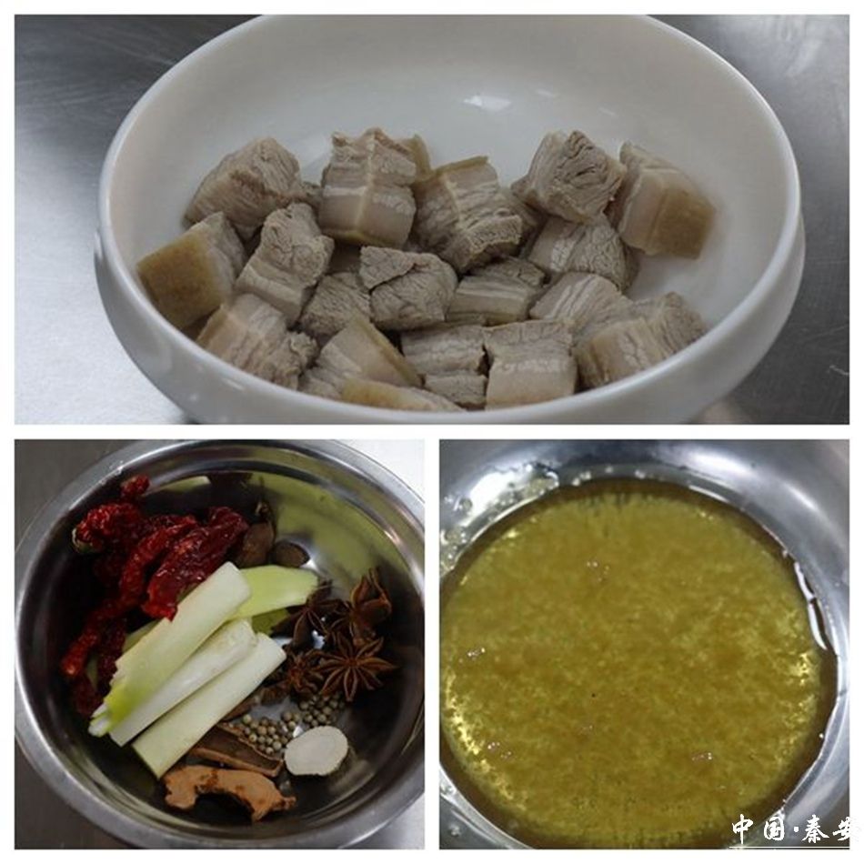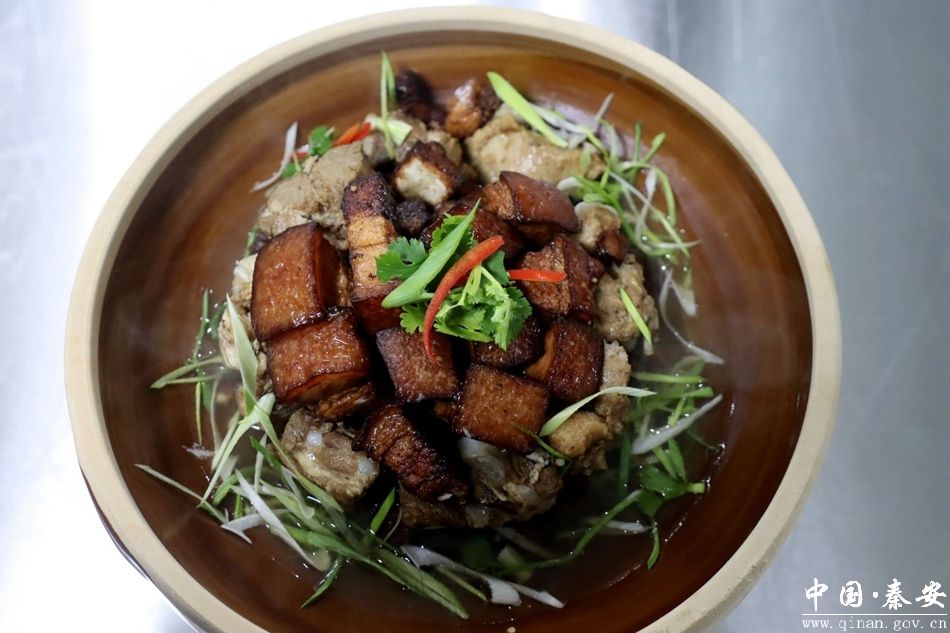 “秦安老式红烧肉,选用五花三层的精五花肉,改刀切成麻将大小均匀方块,抹上老蜂蜜,抹均匀。下入油锅炸到酒红色,然后放到土砂锅中,加入大料、葱、姜、蒜等。大火烧开改小火,煮上5个小时左右,一道美味的红烧肉就做成了。”成纪宴府厨师吕军强告诉记者。再经过一系列的炖煮和调味过程后,肉块饱满鲜美,入口即化,犹如融化在舌尖的幸福。每一块红烧肉都散发着浓郁的香气,让人无法抵挡它的诱惑。