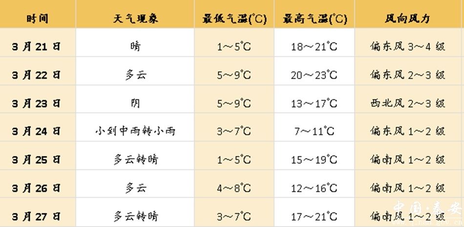 预计21日~25日,秦安县天气以晴或多云为主, 24日有一次明显降温降水天气过程,过程最大累积雨量可达10毫米,前期天气有利于开展旅游活动。