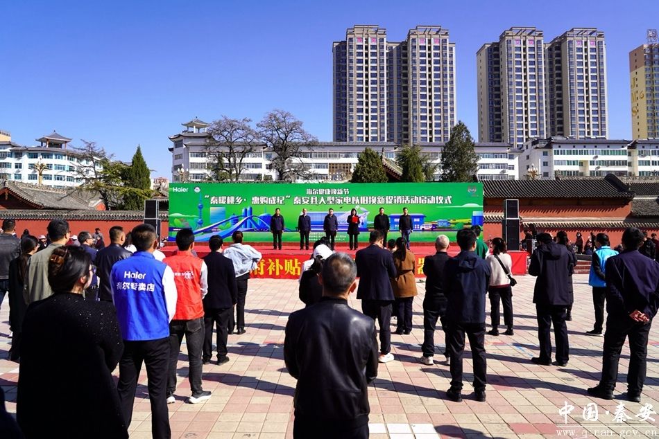 为深入贯彻落实国家推动消费品以旧换新的决策部署和省、市扩内需促消费各项工作安排,抢抓“天水麻辣烫”火爆出圈机遇,进一步聚人气、引流量。3月29日,“秦暖桃乡·惠购成纪”秦安县大型家电以旧换新促销活动启动仪式在兴国文化广场举行。县委常委、纪委书记、监委主任张天龙,县人大常委会副主任逯虹,县政协副主席王建锋,海尔集团甘肃分公司全网零售负责人以及各镇分管领导、县商务局全体工作人员、各限上企业负责人和群众代表共计100余人参加活动。