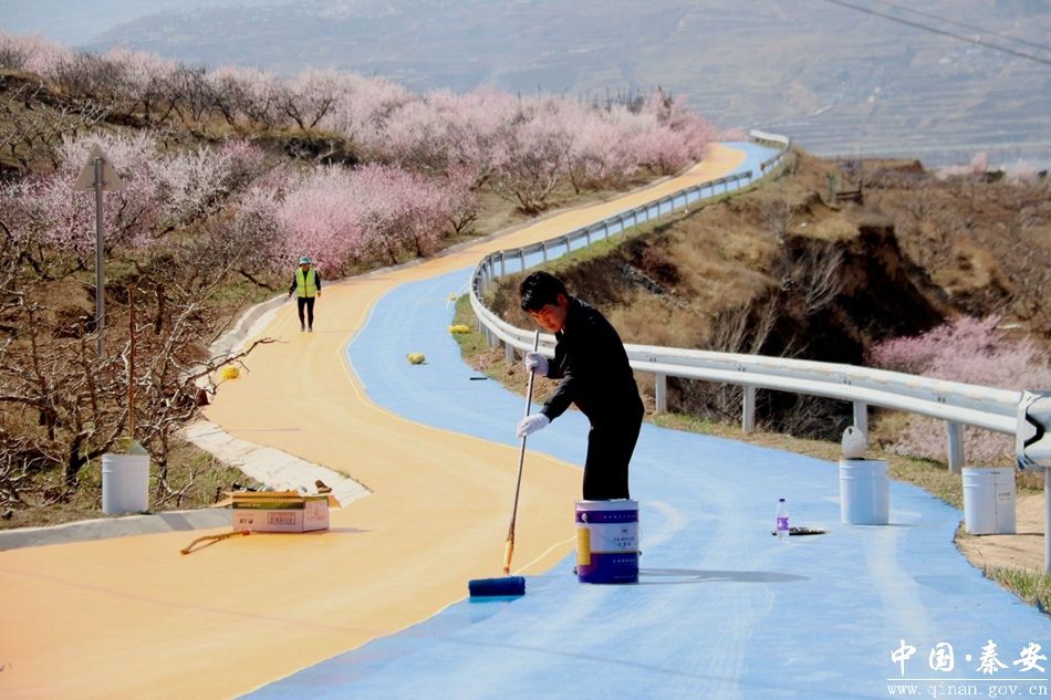 2024年甘肃秦安桃花会即将举办。日前,记者在刘坪镇秦洼桃园景区看到,工人们正在紧锣密鼓地安装滑索地桩、粉涂栅栏、美化步道等,相关筹备工作正在有序稳步推进中。