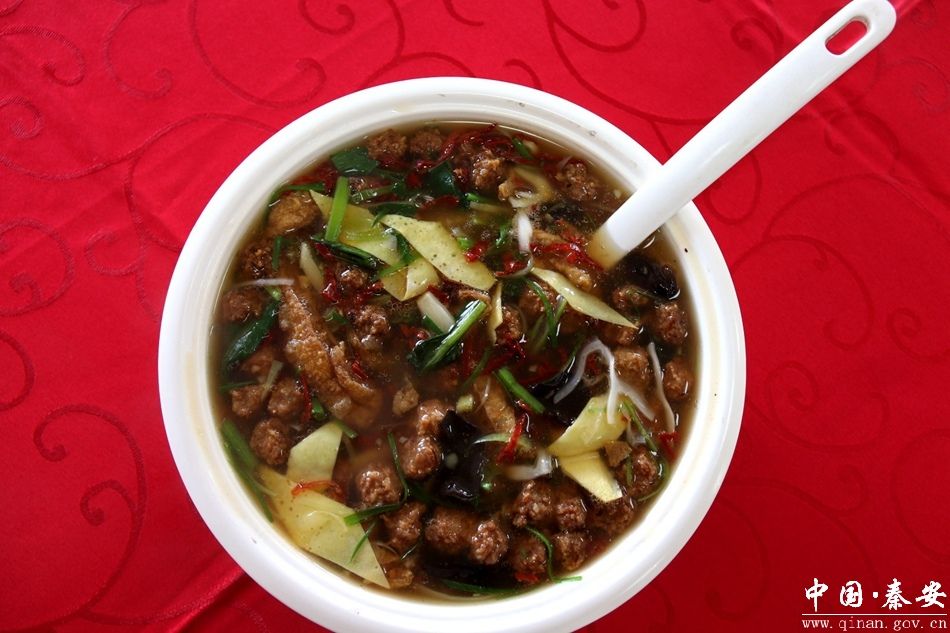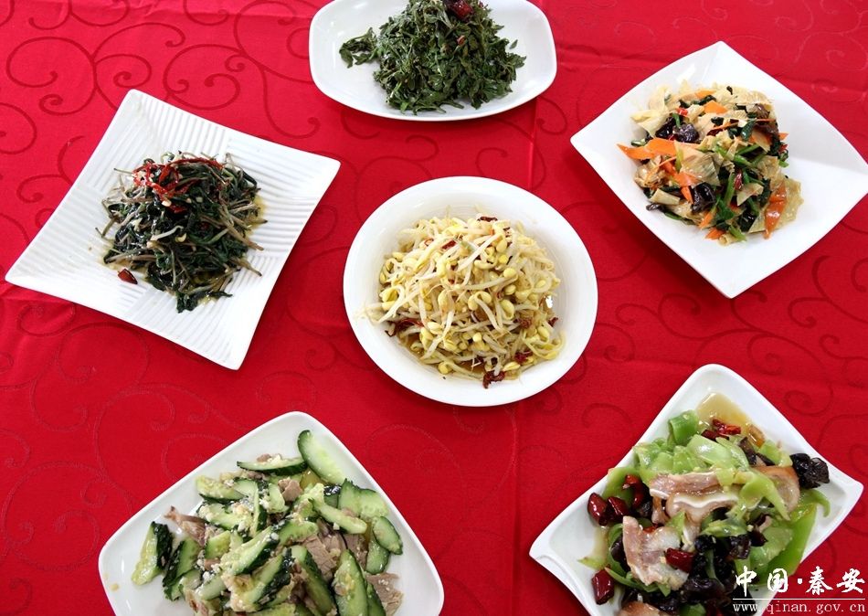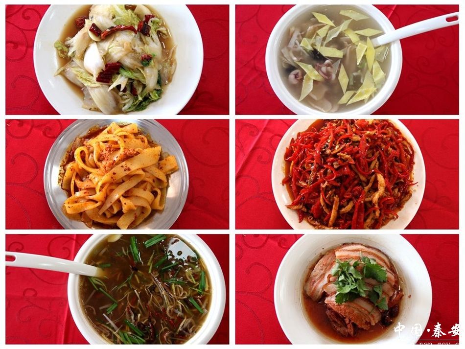 为了让游客们吃到地道的秦安特色菜品,“凤山驿站”的靳师傅早早做足了准备,只见他手轮大铁勺,扬勺浇油,烈火烹油,锅勺翻飞、烹调摆盘,行云流水、潇洒自如之间,不一会儿,一道道色香味俱全的凉菜拼盘、酸辣肚丝汤、辣椒炒肉、杂烩鱿鱼汤等具有秦安特色的美味佳肴就端上了餐桌,令人垂涎欲滴,让在场的游客大饱口福。
