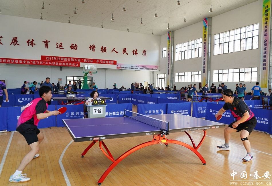 4月12日下午, 2024年甘肃秦安桃花会主题系列活动——秦安县第五届“桃花杯”乒乓球邀请赛在县全民健身中心开赛。来自陇西、兰州、陇南、静宁等15个市县的42支参赛队伍160多名运动员参加比赛。