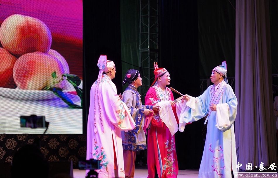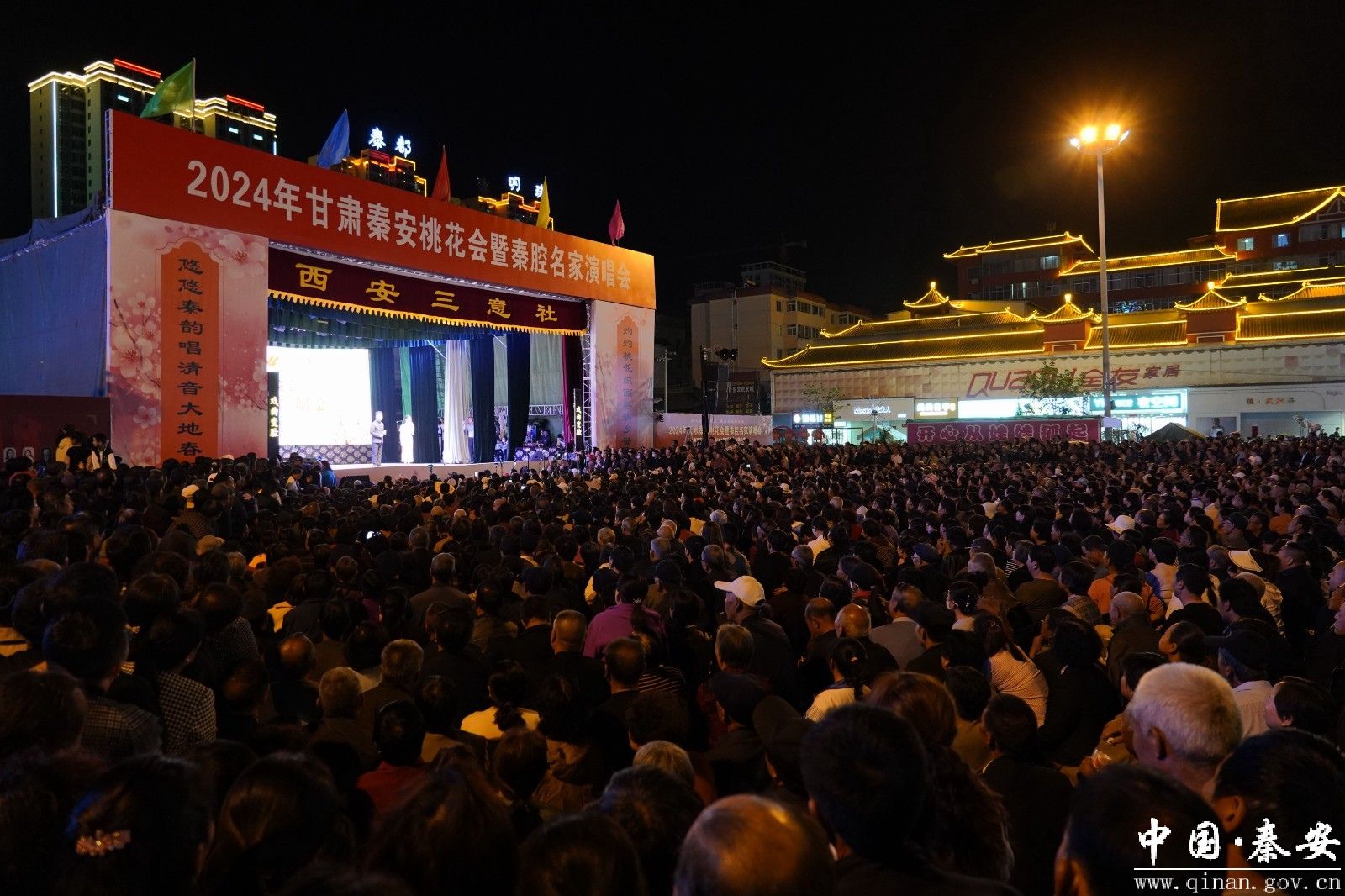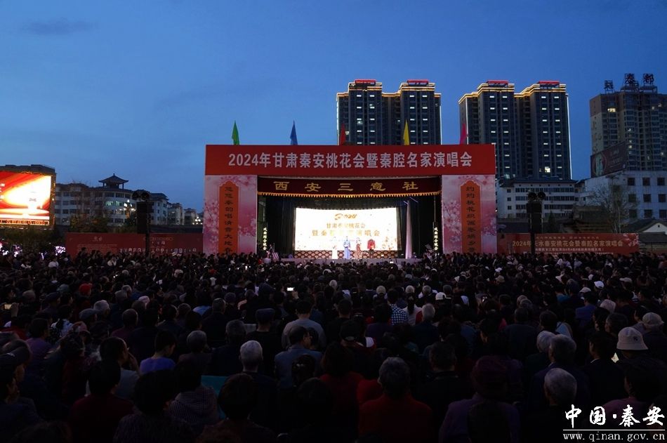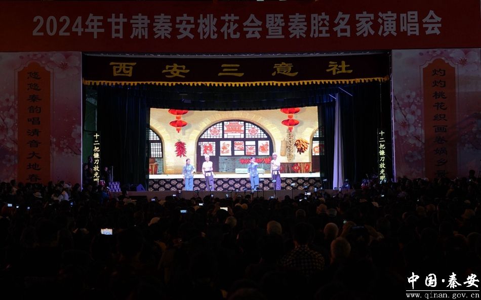 4月14日晚,2024年甘肃秦安桃花会系列活动——秦腔名家戏曲综合晚会在兴国文化广场开演,整场演出高潮迭起、精彩纷呈、掌声笑声不断,来自西安三意社的演员们用他们的热情与活力,给在场的观众献上了一道丰盛的节日文化大餐。