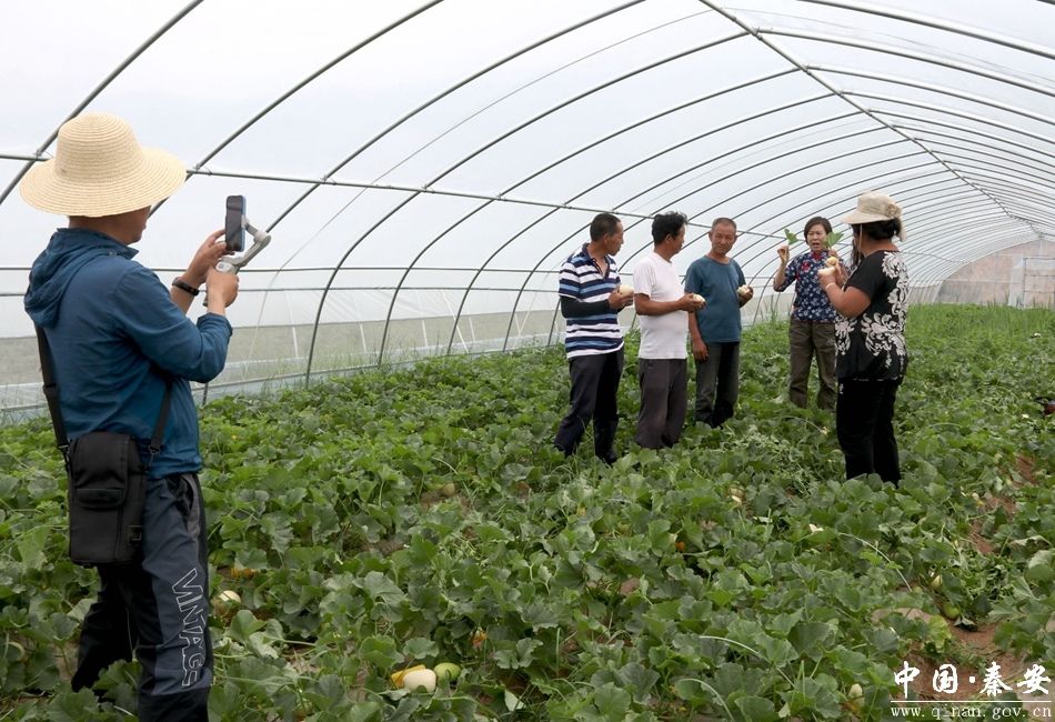 在白脆瓜种植基地,网红达人及其团队一边拍摄宣传素材,编辑整理后通过抖音、快手、微信等平台对白脆瓜进行宣传推广。一边现场直播,向粉丝朋友介绍秦安白脆瓜品质、特点及生长环境,并实地采摘、试吃。