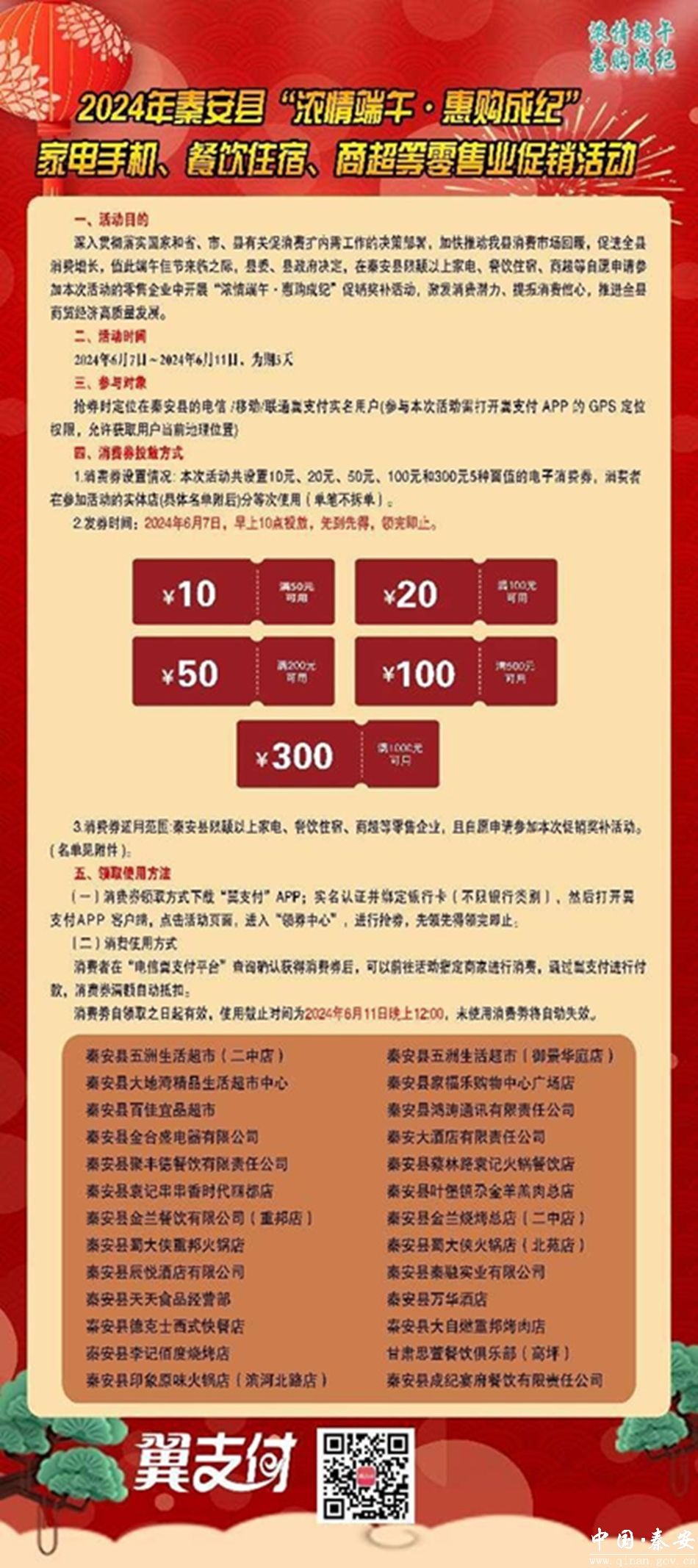 为认真落实国家和省市促消费政策,进一步提振市场信心,推动县域经济高质量发展,按照县委、县政府工作安排,6月7日,秦安县商务局举办的2024年秦安县“浓情端午·惠购成纪”家电手机、餐饮住宿、商超等零售业促销补贴活动正式启动。