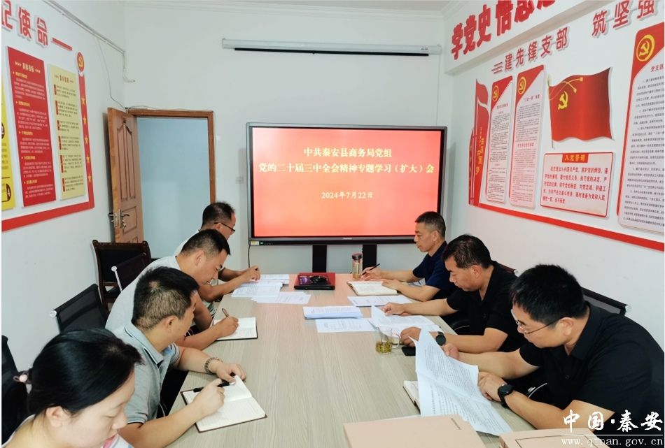 7月22日,秦安县商务局党组召开(扩大)会议,传达学习党的二十届三中全会精神,研究部署学习宣传贯彻工作。全体干部职工参加会议。