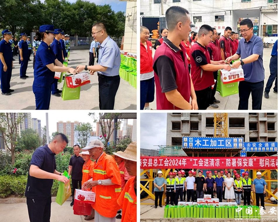 为做好防暑降温工作,保障广大户外一线职工的健康权益,8月2日,秦安县领导蔡鹏云、任云飞、郑博,以及县总工会领导班子成员分别带队深入基层一线开展“工会送清凉 防暑保安康”慰问活动,为炎炎烈日坚守奋斗在工作岗位的一线职工们撑起夏日关爱“遮阳伞”,为酷暑“降”温,让爱心“升”温。