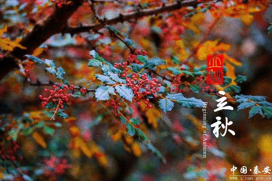 立秋后,自然界中阴阳之气开始转变,阳气渐收、阴气渐长,万物随阳气下沉而逐渐萧落。秋季最明显的变化是草木的叶子从繁茂的绿色到发黄,庄稼则开始成熟,所以就有了晒秋的农俗现象,农民利用房前屋后及自家窗台、院落、屋顶等晾晒农作物。此时节,秦安花椒飘香,火红的花椒树把村庄装点得一派瑰丽,红彤彤的花椒映红了成纪大地,农民把采摘好的花椒晾晒出来,随处可见由一颗颗颗粒饱满、色彩红艳、香气麻郁的花椒铺成的“红毯”。除此之外,民间还有“咬秋、“贴秋膘”等习俗以迎接秋天的到来。