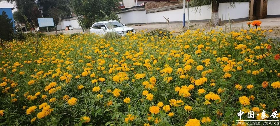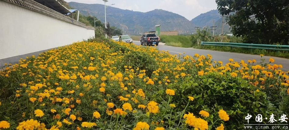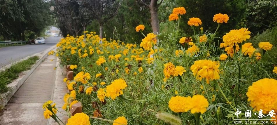 当前,秦安县叶堡镇靖天路段栽种的万寿菊花开繁茂、花大色艳,不仅美化了靖天公路沿线环境,还扮靓了和美乡村。
