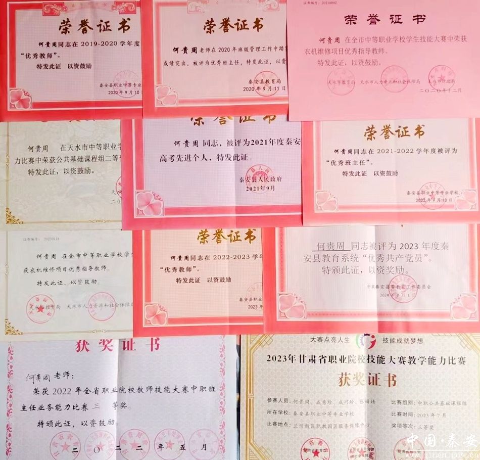 秦安职教副校长任军强说:“何贵周老师从事职业教育七年间,对工作认真负责、兢兢业业,每天起早贪黑。他本着适合学生的教育就是最好的教育,不抛弃、不放弃每一位学生的发展,以抓班级管理,促班风、振学风,以先进的教学理念、方法引导每一位学生健康成长。在今年的职教高考当中,他们班以11人的本科上线人数位居所有班级之首,这些学生被甘肃农业大学、天水师范学院等院校录取,实现了我校本科上线率创历史新高。”