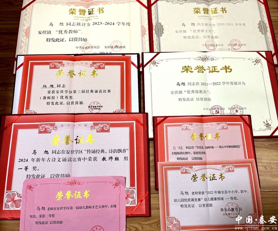 多年来,马旭积极参加各种比赛,凭借出色表现,曾多次获得“优秀班主任”“优秀保教员”,“县优质课”一等奖、“古诗文诵读”一等奖等各种奖项。