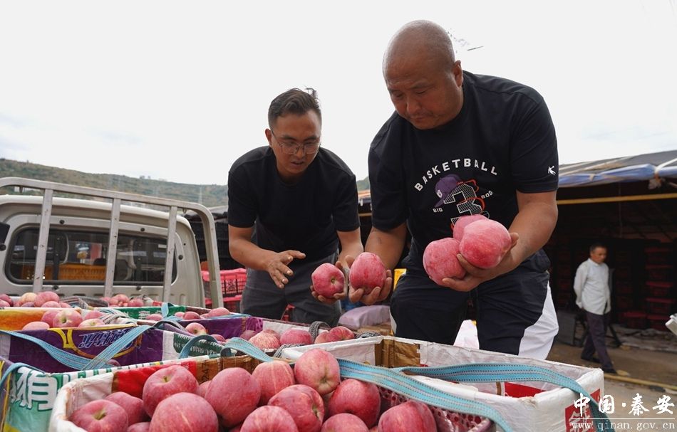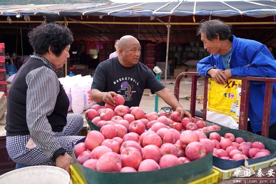 有着20多年代办经验的果品经纪人王海军一看到果农拉来的苹果,就大声吆喝起来。“秦安的苹果口感好,吃起来很甜。现在成熟了,在收购期间。一天收购量在2到3万斤左右,主要发给北京、河南等全国各地的客户。”果品经纪人王海军介绍道。
