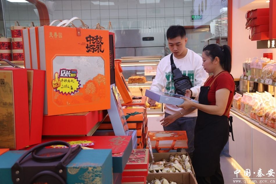 “我们为迎接中秋对卖场进行布置,有盒装月饼、散装月饼、时令水果、水果礼盒,价格实惠,品种齐全,为广大顾客营造了良好的中秋氛围。”麦香园烘焙店销售员胡小霞告诉记者。