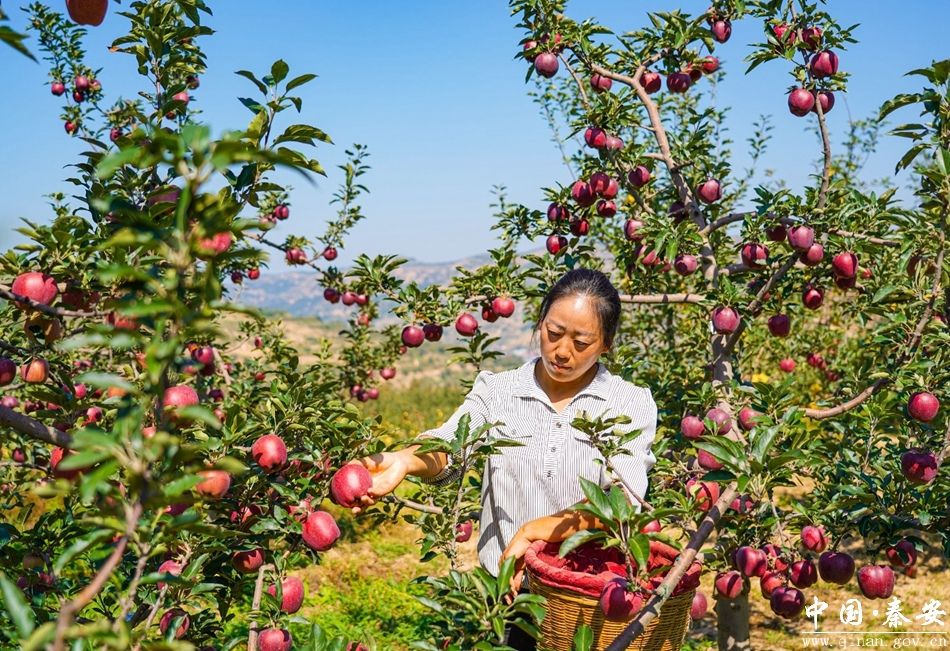在莲花镇冯沟村的苹果园里,累累果实挂满枝头,一个个鲜红透亮、饱满圆润的苹果在蓝天、绿叶的映衬下格外诱人。果农程淑芳和丈夫穿梭在果树之间,小心翼翼地采摘一个个成熟的果子,忙碌了一整年,这些色泽鲜艳的苹果将为他们带来实实在在的收益。