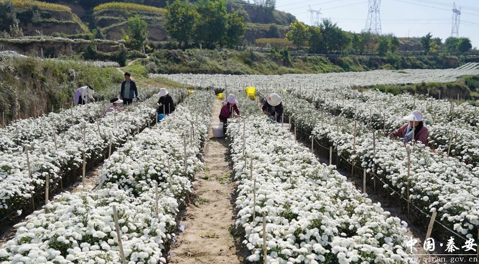 秋来采菊忙,添得满袖香。时下,位于秦安县陇城镇山王村农业专业合作社的50多亩菊花花开正好。走进菊花种植基地,仿佛置身于一片花海,处处菊香弥漫。放眼望去,层层叠叠的菊花竞相绽放,一垄垄,一簇簇与田野山径交相辉映,勾勒出一幅美丽的画卷。拎筐提篮的村民穿梭忙碌于田间地头,采摘、分拣,一派热闹繁忙的丰收景象。