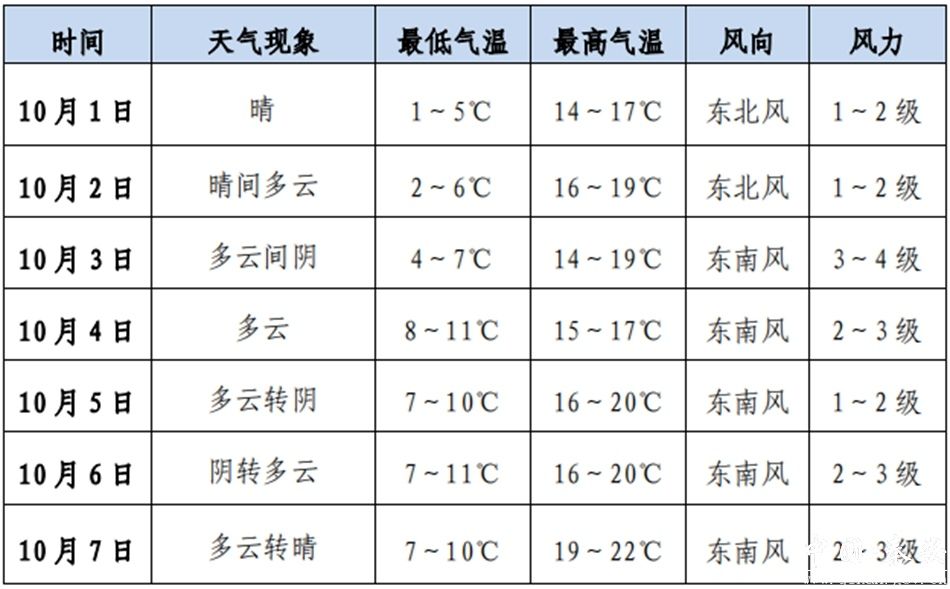 预计国庆假期,我县天气以晴或多云为主,无明显降水天气, 秋高气爽,但早晚气温低,总体适宜户外活动和外出游玩。