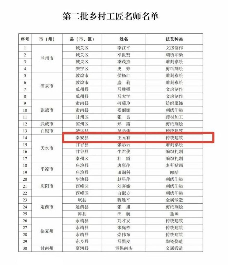 近日,省农业农村厅、省教育厅等7个部门联合公布了第二批全省乡村工匠名师和乡村工匠名单。秦安县王元有、赵进科、康晓刚、胡遂明、胡建强5人被认定为省级乡村工匠。其中王元有更是兼获“乡村工匠名师”称号。