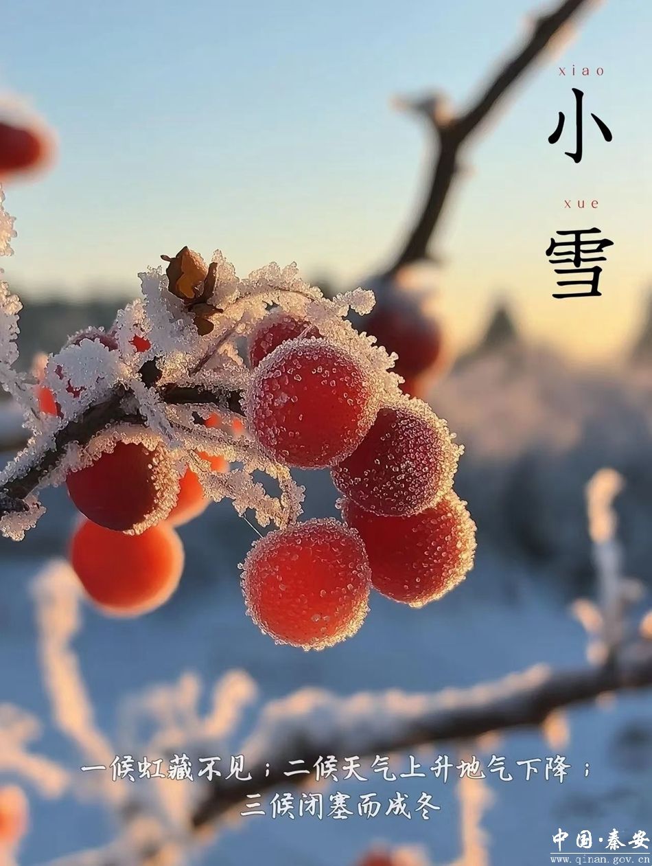 小雪有三候,“一候虹藏不见;二候天气上升地气下降;三候闭塞而成冬。”一候时,气温降低,雨水化为雪花,彩虹隐匿不见。二候之际,阳气上升,阴气下沉,天地间阴阳不交,万物渐失生机。至三候,天地闭塞,寒冬正式降临。