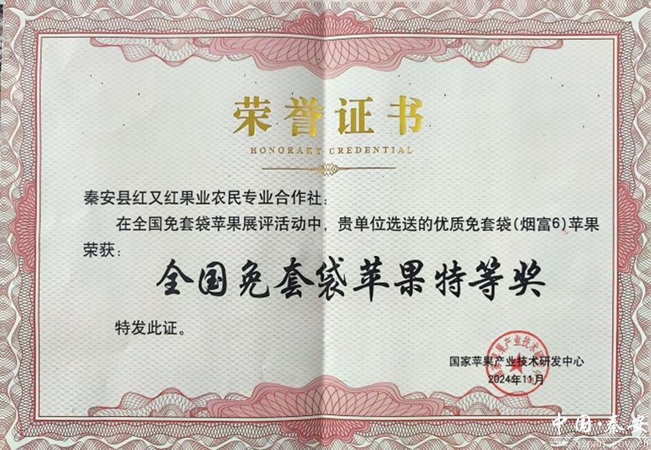 11月22日至24日,全国苹果免套袋轻简化精准高效优质生产技术研讨培训会暨苹果免套袋栽培技术协作组工作交流会在山东省烟台市蓬莱区举办,由秦安县红又红果业农民专业合作社选送的免套袋(烟富6)苹果在全国免套袋苹果展评活动中获得特等奖。
