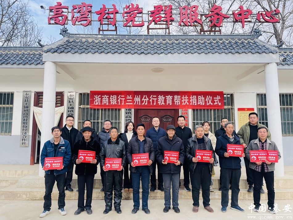 12月5日,浙商银行兰州分行教育帮扶捐助仪式在秦安县王铺镇高湾村党群服务中心举行。秦安县委副书记蔡鹏云、浙商银行兰州分行副行长郭小芬参加活动。