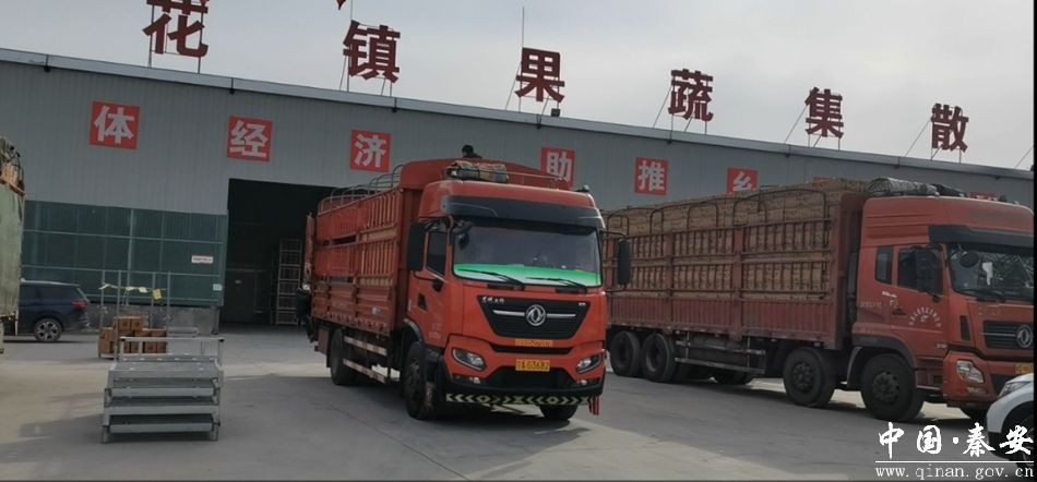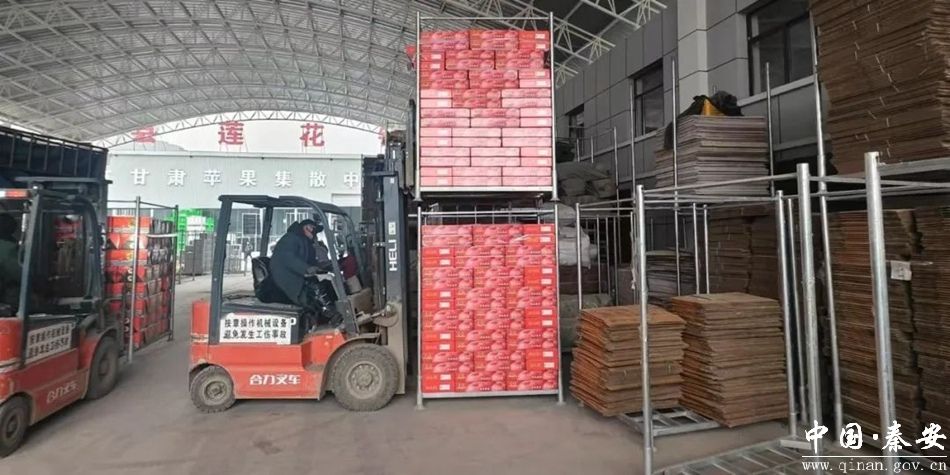 一辆辆平板车底铺六箱,每列三箱并立,缓缓将苹果从冷库中运出。卸果,擦拭果皮,分装果箱,排列整齐,封箱,装车。经过秦安县莲花镇果蔬集散基地的一系列工序,这些早已被客商预订的苹果将跨越近两千公里,出现在我国上海、广州等地的顾客手中,甚至远渡重洋至马来西亚、印度等国家,为当地居民奉上来自中国西北小镇的“献礼”。