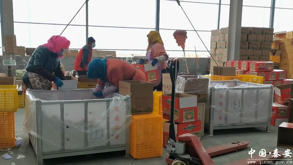 在莲花镇果蔬集散基地,工人们正在有序分拣、打包、搬运冷藏货物,现场一派繁忙景象。“我是莲花村村民,自果蔬集散基地建成以来,每年都在这里包苹果,每月能挣3800元左右,一年能包七个月,可以给家里增添一笔不小的收入,而且基地离家近,工作时间也灵活,不会耽搁照顾家庭。”务工人员车敏霞喜笑颜开地说道。
