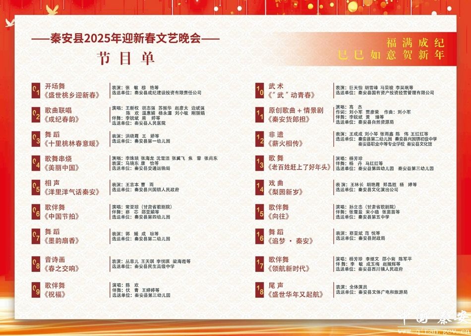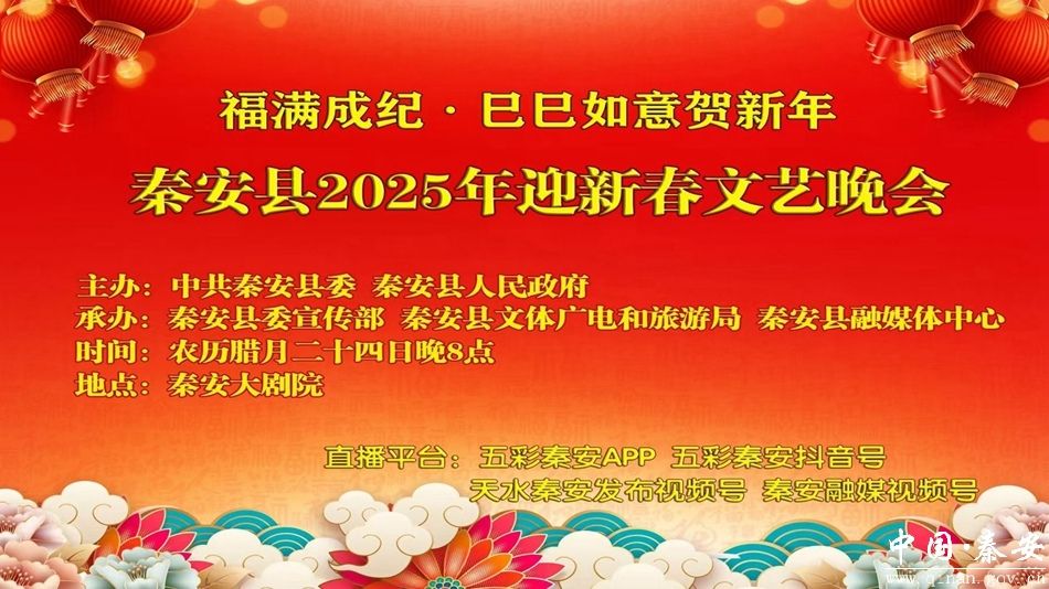 爆竹声声辞旧岁,锣鼓锵锵贺新年。“福满成纪·巳巳如意贺新年”秦安县2025年迎新春文艺晚会,将于农历腊月二十四日晚8点在秦安大剧院浓情上演。为了让更多观众能够实时观看这场文化盛宴,晚会还将通过五彩秦安APP、五彩秦安抖音号、天水秦安发布视频号以及秦安融媒视频号进行同步直播。