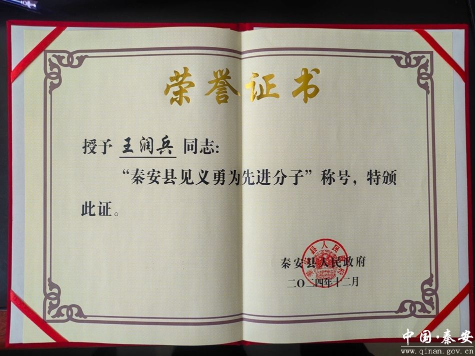 1997年出生的王润兵家住莲花镇郭河村,2017年怀着对军营的热爱毅然从军入伍,他训练刻苦,成绩优异,生活中团结战友乐于助人,始终把“全心全意为人民服务”的宗旨铭记于心。他在人民群众生命安全受到严重威胁的紧急关头,临危不惧、挺身而出,用实际行动诠释了军人的担当与奉献,为全社会作出了表率、树立了榜样。2024年12月,王润兵被秦安县政府授予“秦安县见义勇为先进分子”荣誉称号。