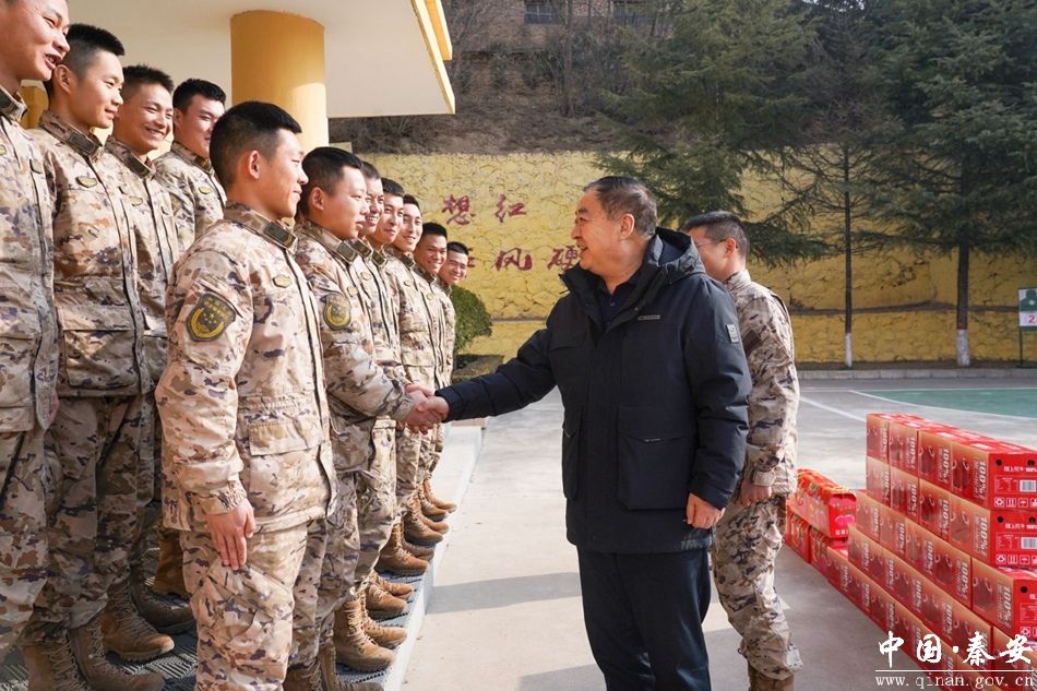 在县武警中队,杨喜春与部队官兵亲切交流,详细询问其工作生活情况,深切表达了地方党委、政府对人民子弟兵的深情厚意,感谢驻军单位官兵对秦安经济社会建设和发展的关心与支持。希望大家在新的一年里,继续支持、关心秦安县建设和发展,加快建设幸福美好新秦安。秦安县将一如既往发扬拥军优属光荣传统,大力支持部队建设和国防建设,强化服务保障,落实优抚安置政策,不断开创军地融合发展新局面。