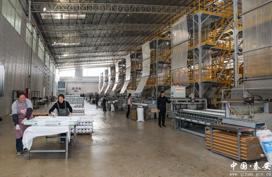 在福雨塑业生产车间,机械设备轰鸣作响,制膜机器开足马力紧张运转,全自动生产线上源源不断地产出各种型号的农用薄膜。一卷卷刚刚吹塑成型的地膜整齐地堆放着,工人们测量、称重、打包,一刻不停息,一片热火朝天的景象。