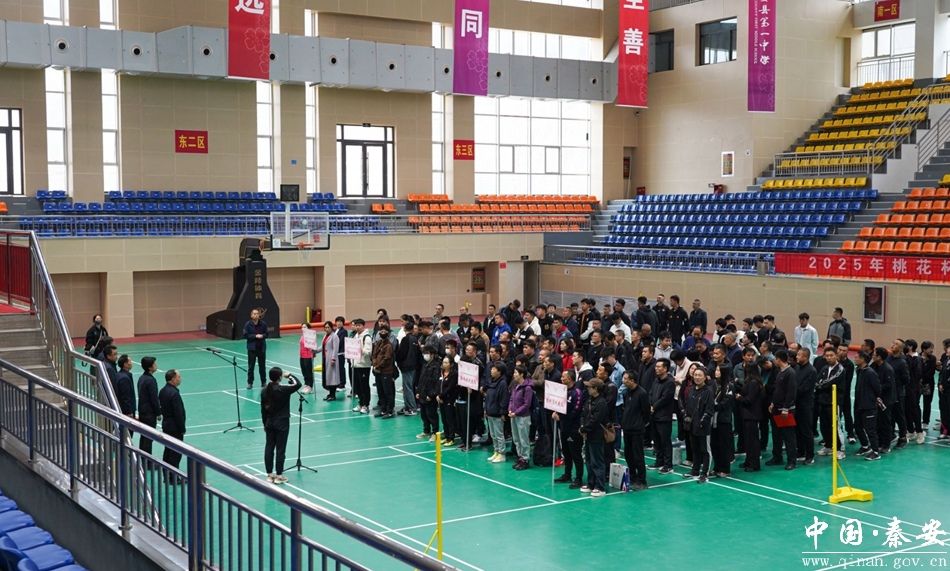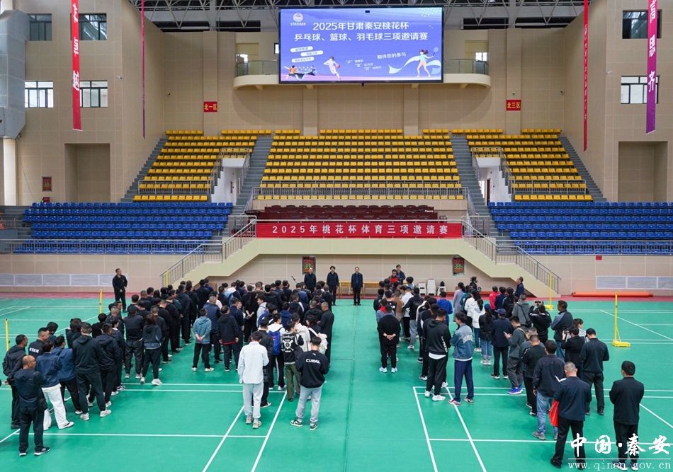 4月11日,2025年甘肃秦安桃花会乒乓球、羽毛球、篮球体育三项邀请赛在县体育馆开赛。市体育局副局长刘松法,县人大常委会副主任任云飞、县政府副县长蒋露,县直有关部门、单位负责人和裁判员、教练员、运动员及爱好者参加活动。