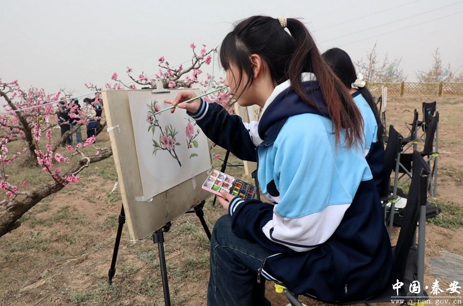 桃花会不仅是一场赏花盛宴,更成为艺术创作与文化交流的平台。秦安五中美术专业课老师张锐带领260余名高一高二美术专业学生来到现场写生,用画笔定格春日盛景:“外出写生是艺术学习和创作中至关重要的实践环节,把课堂上的静态知识应运到动态场景中。为我们的乡村振兴起到微薄之力,增光添彩,让更多的游客来到秦安。”学生牟思思也分享道:“现场写生,可以培养我们的观察能力,提升我们的创新技巧和对色彩的感知,也使我们更加接近大自然,感受秦安人文美,得到身心放松。也是想在桃花会期间通过画笔来展现和宣传秦安。”