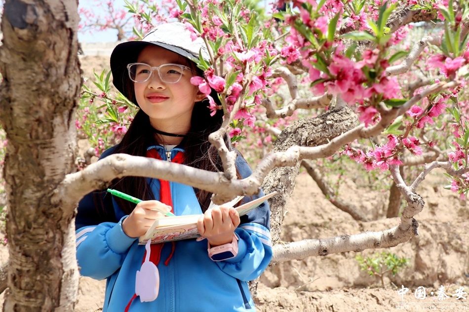 学生赵思瑶说:“很高兴来到秦安的刘坪万亩桃园参加研学活动,当刘坪的第一缕暖风把桃花的花瓣吹到我的脸上时激发了我的创作灵感。”
