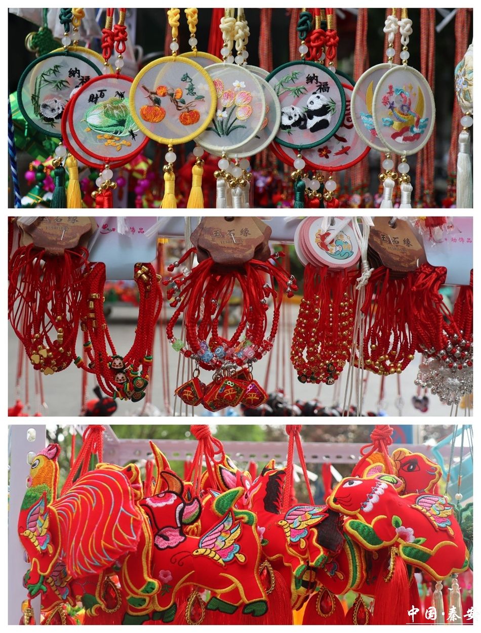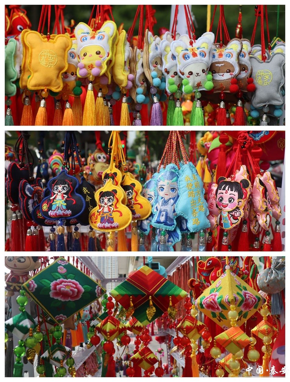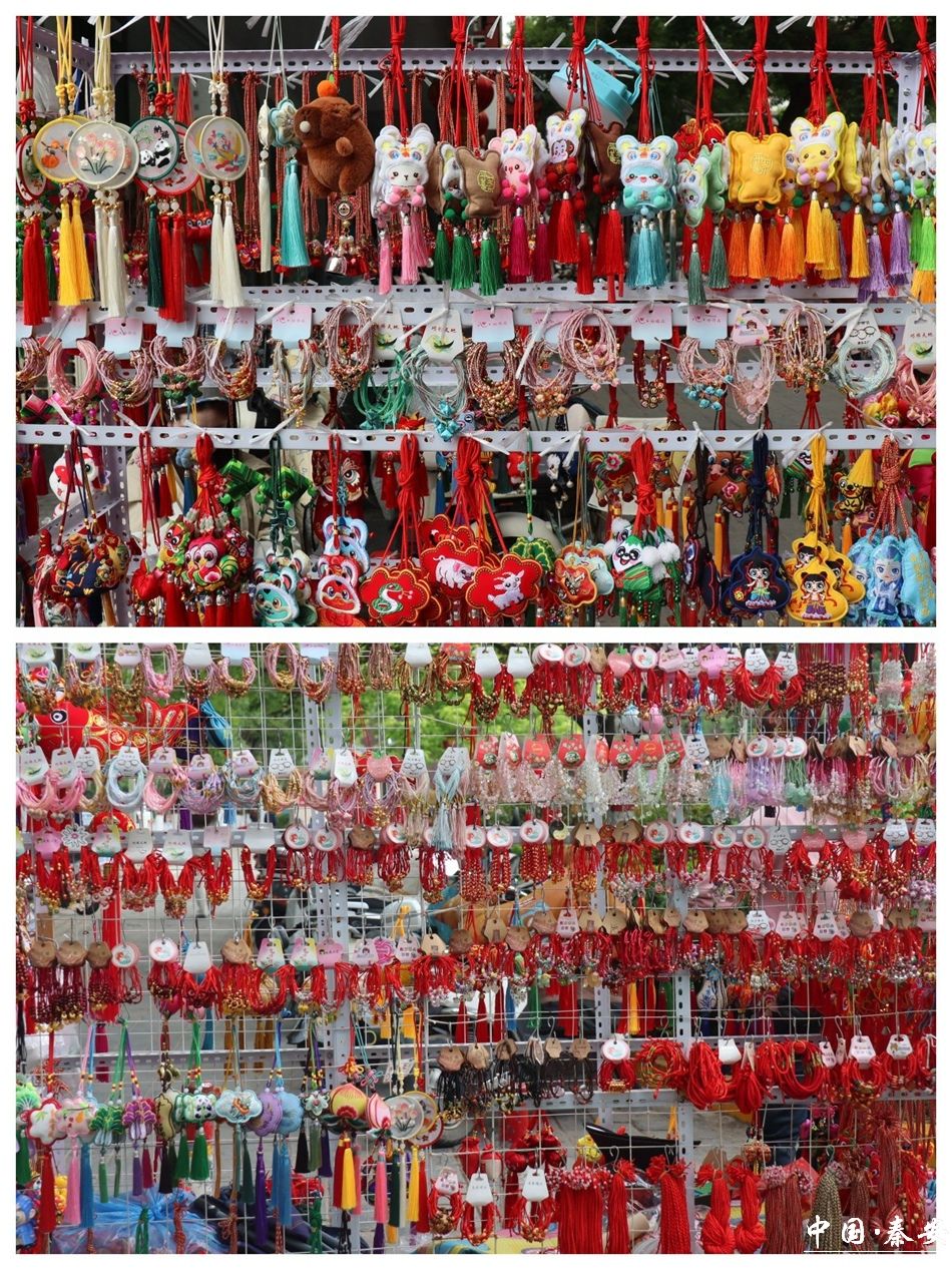 在秦安县步行街,彩绳荷包摊位一字排开,五彩斑斓的商品令人目不暇接。各式彩绳、荷包、福袋香囊、艾草门挂等琳琅满目。手工制作的荷包造型独特、形态各异,既有传统的花鸟虫鱼、十二生肖等经典样式,也有融入现代元素的创新设计,摊主刘女士的木架上,缀满“柿柿如意”“好运莲莲”等创意荷包,内芯填充着晒干的艾草、薄荷和雄黄粉,品类繁多的荷包个个都做得精致鲜艳,活灵活现,形成一片独特的“荷包海洋”。