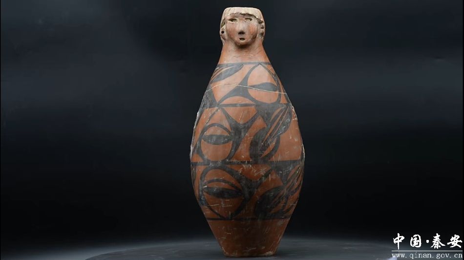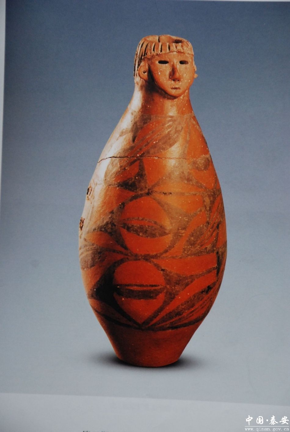 这件距今5000余年的人头瓶,塑造了一位端庄、典雅、古朴、大方的美女形象,体现远古先民源于现实又超越现实的艺术表现手法,把人头与葫芦瓶巧妙地结合在一起,有趣生动,是大地湾仰韶彩陶的代表作品,也是我国史前时期集彩陶、雕塑、造型于一身的杰出艺术品。在大地湾遗址出土的上千件陶器中,塑有人像的彩陶瓶仅此一件,为国家一级文物。