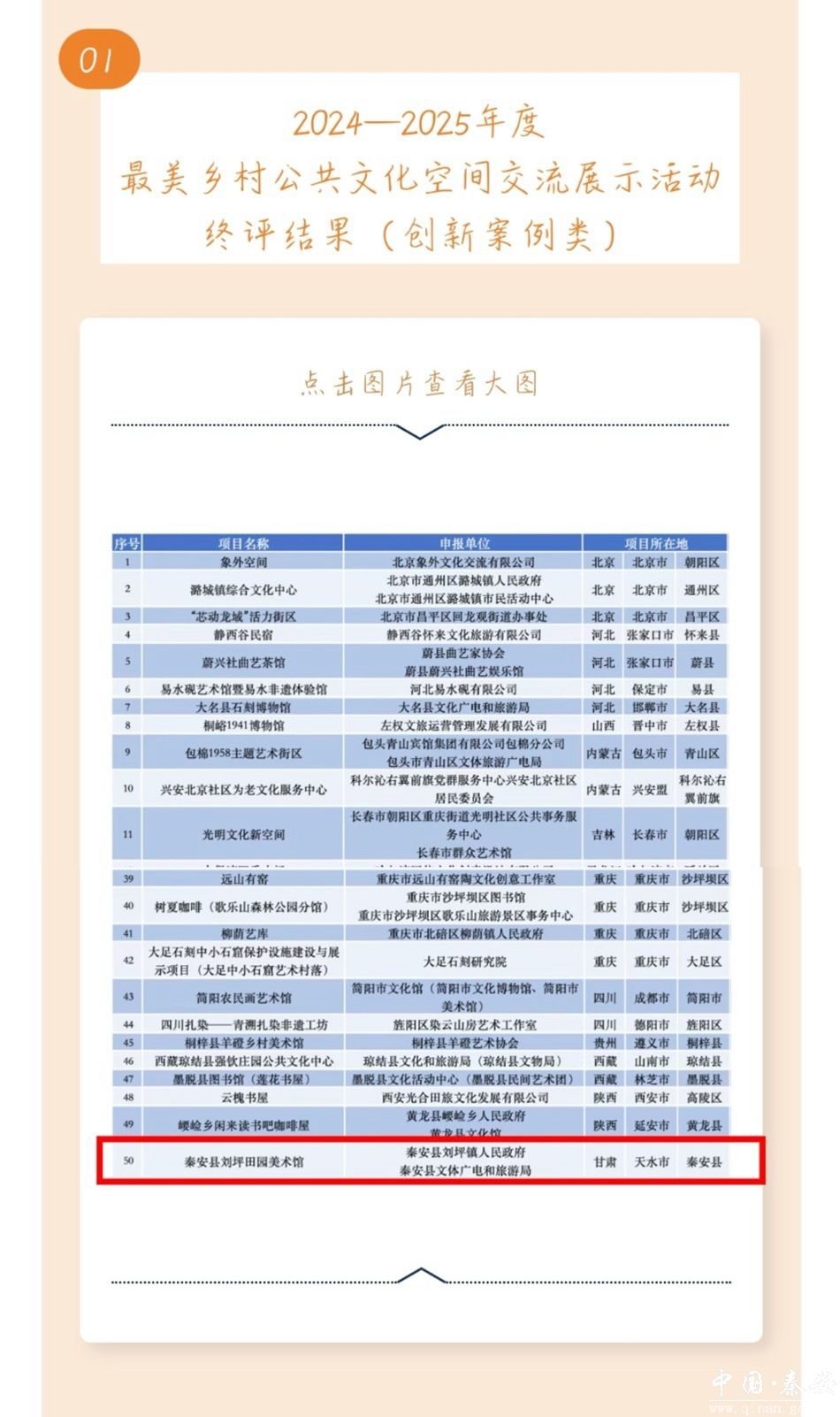 日前,文化和旅游部全国公共文化发展中心等单位联合公示2024—2025年度"最美乡村公共文化空间"终评结果,秦安县刘坪田园美术馆成功入选,成为甘肃省唯一上榜项目。