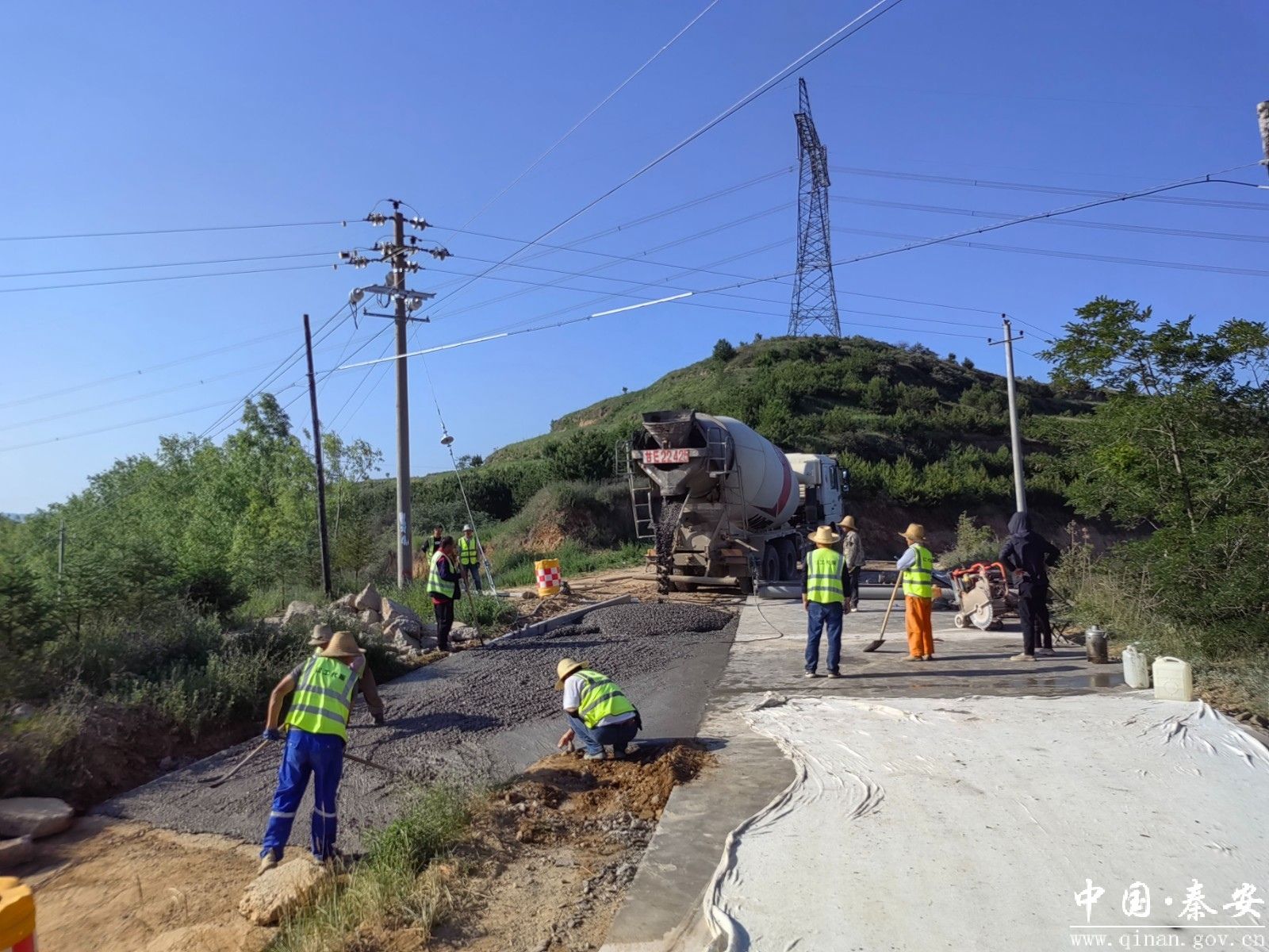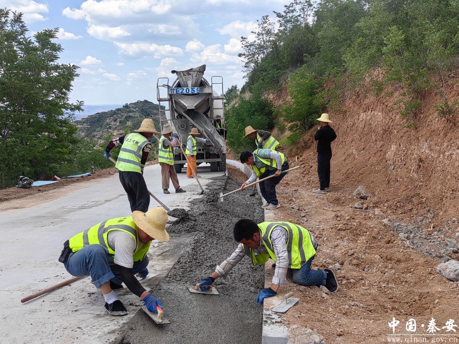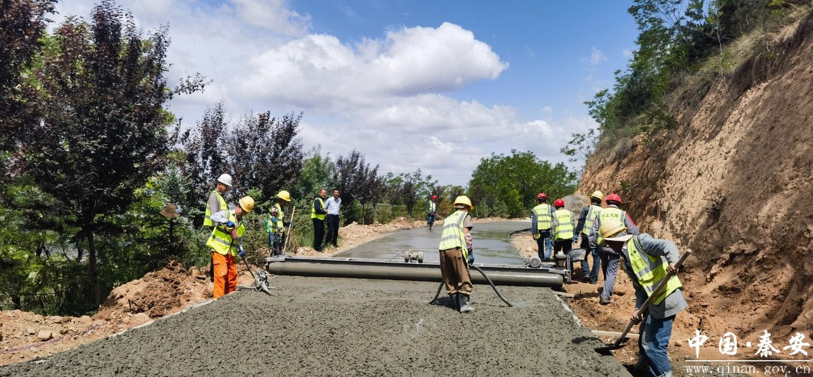 盛夏时节,走进秦安县中山镇2025年农村道路以工代赈项目施工现场,映入眼帘的是身穿浅绿施工马甲的工人和各种机械繁忙的景象,工人们熟练地拉线支模,工程车辆来回穿梭,混凝土经过摊铺收光环节,路面基本成型,洒水和苫盖等养护作业过后,一条宽阔平整的农村道路重新连接起了簸箕、郭箕、香山、山后、车山村5个行政村。