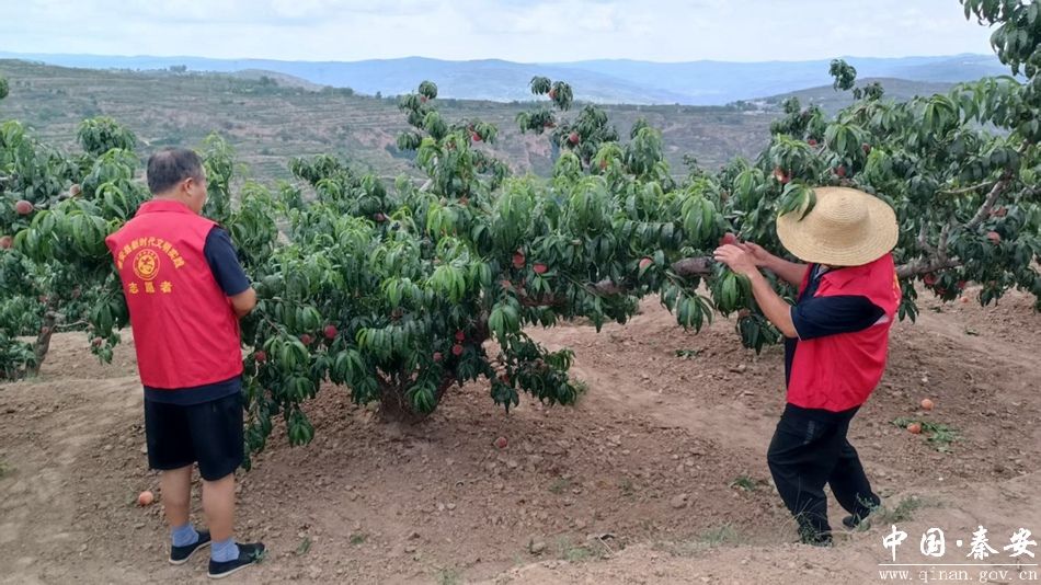 盛夏时节,秦安县刘坪镇万亩桃园迎来蜜桃采收旺季,饱满多汁的果实挂满枝头。为积极应对近期多变天气带来的灾害风险,帮助果农筑牢丰收防线,刘坪镇组织新时代文明实践志愿者,深入田间果园开展采摘技术指导与气象灾害预防志愿服务活动。