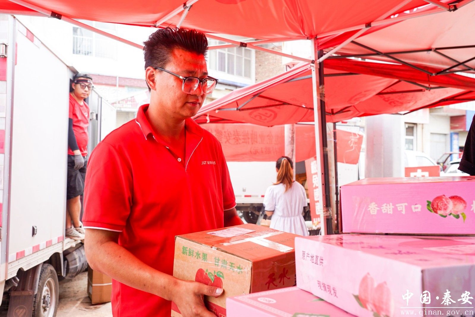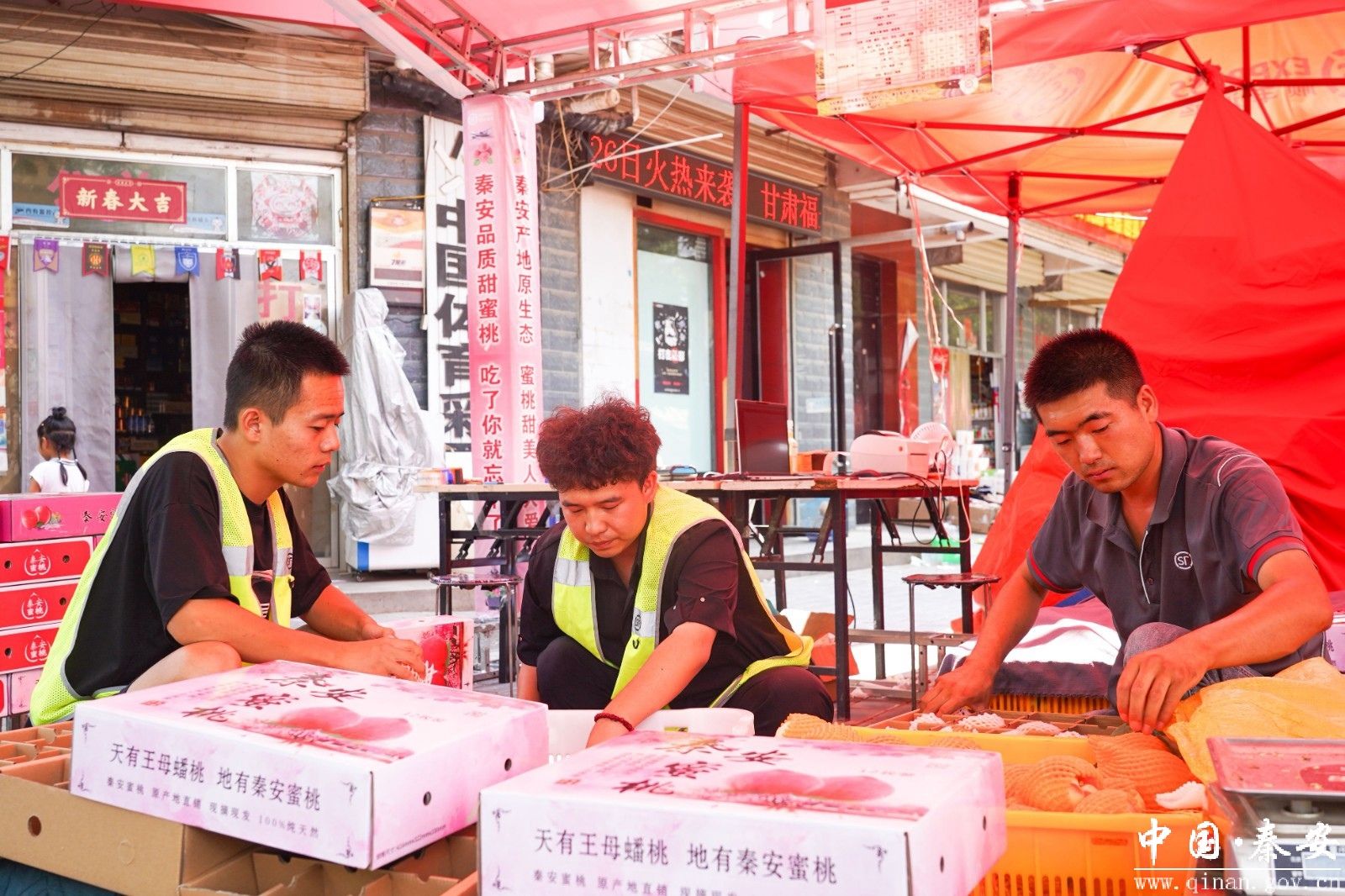 在极兔快递、邮政快递秦安网点现场,工作人员正忙着对蜜桃进行称重、打包、张贴快递单、装车,一道道工序完成之后,千余件印着 “秦安特产” 的优质蜜桃很快将运往全国各地。